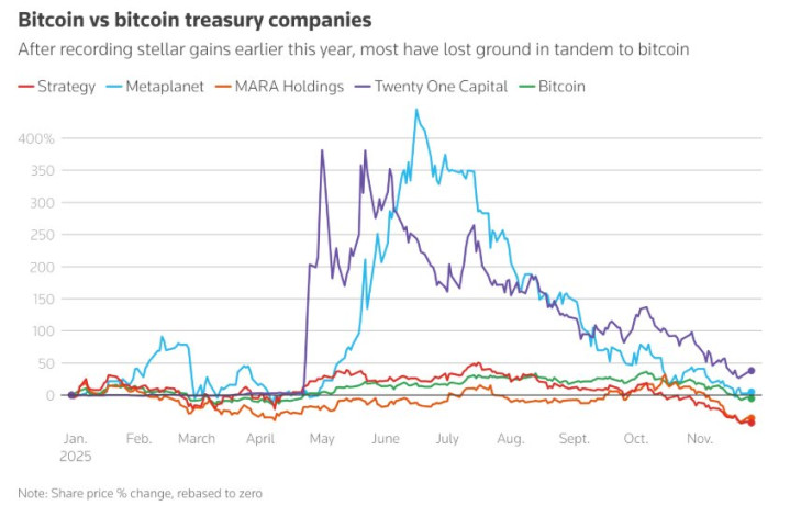 上述的一张折线图展示了今年比特币价格与比特币金库公司们股价的对比走势。